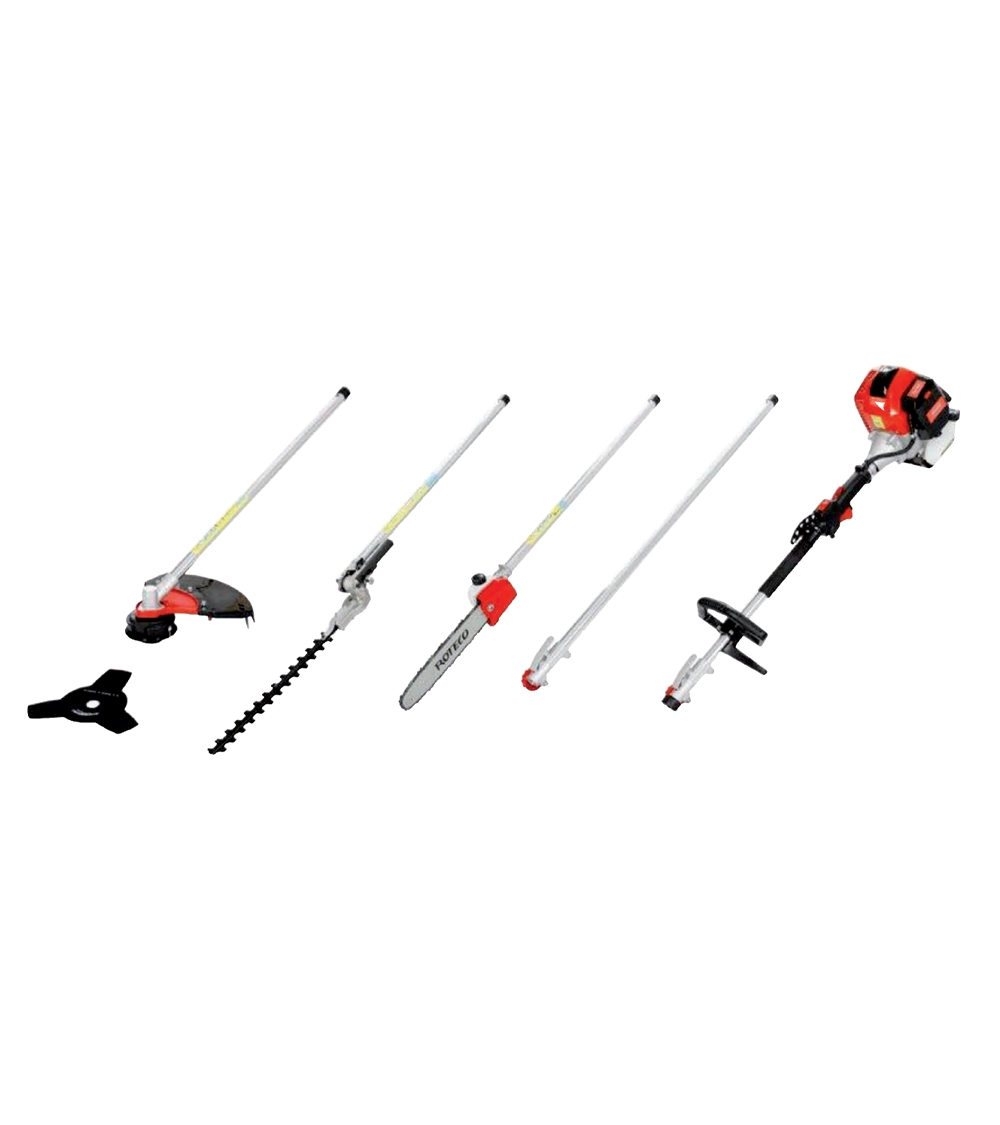 MAQUINARIA Desbrozadora multifunción Roteco MT2600 Ficha técnica Tipo: Podadora Motor: 2T 50,8 CC Cabezal: Hilo automático + Disco Grass Arnés: Confort Cortasetos: Orientables 90º Extras: Extensión accesorios